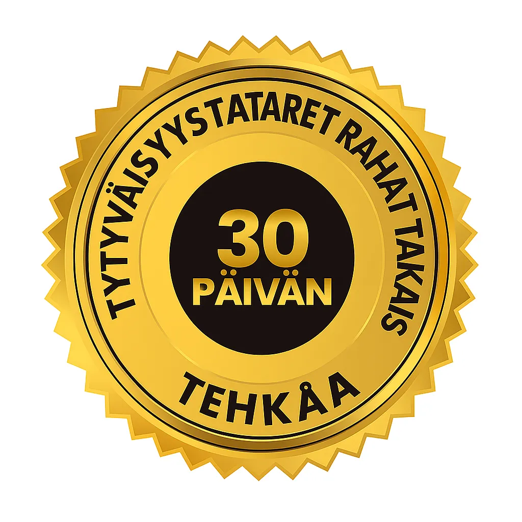Tilauksesi on suojattu 30 päivän palautuskilvellä. Etkö ole häkeltynyt? Ota yhteyttä, niin palautamme jokaisen sentin – ei kysymyksiä.